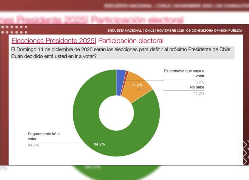 Respecto de la participación, la mayoría de los encuestados afirmó que acudirá a las urnas el 14 de diciembre de 2025: 84,2 por ciento dijo que “seguramente irá a votar”, 3,6 por ciento señaló que “es probable que vaya”, y 11,2 por ciento no lo tiene claro.