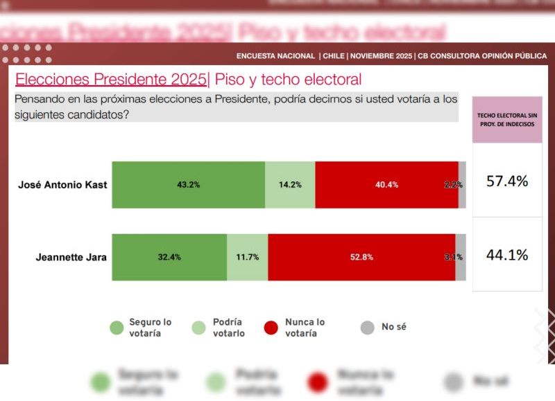 Jara obtuvo 32,4 por ciento de voto seguro y 11,7 por ciento de voto posible, lo que la llevó a un techo de 44,1 por ciento. En rechazo firme, Kast registró 40,4 por ciento de “nunca lo votaría” y Jara 52,8 por ciento en esa categoría.