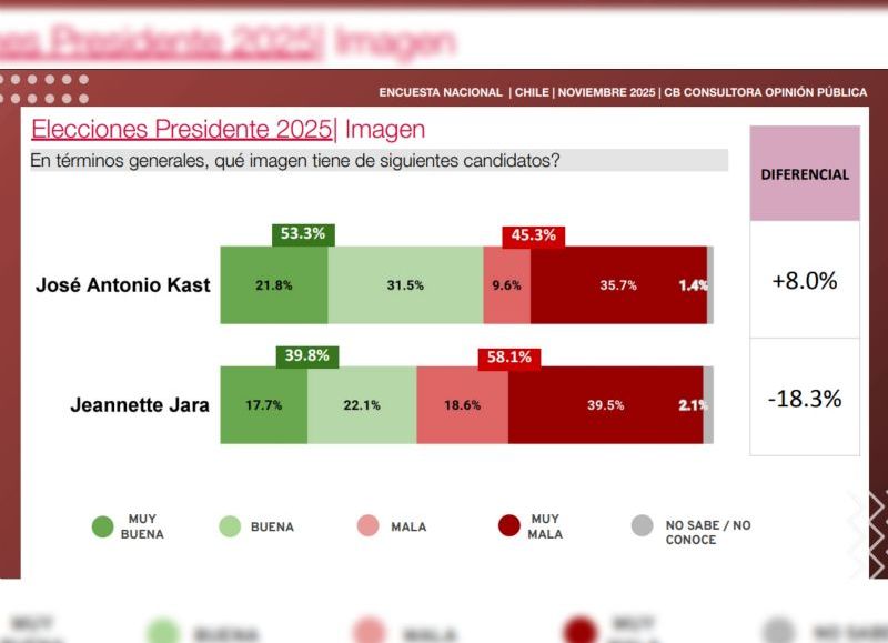 En imagen pública, Kast lideró con 53,3 por ciento de evaluación positiva —sumando “muy buena” más “buena”— y 45,3 por ciento de visión negativa. Jara, en cambio, alcanzó 39,8 por ciento de percepción favorable y 58,1 por ciento de evaluación negativa. De esta forma, el balance para Kast quedó con un diferencial de +8,0 por ciento, mientras que Jara registró -18,3 por ciento.
